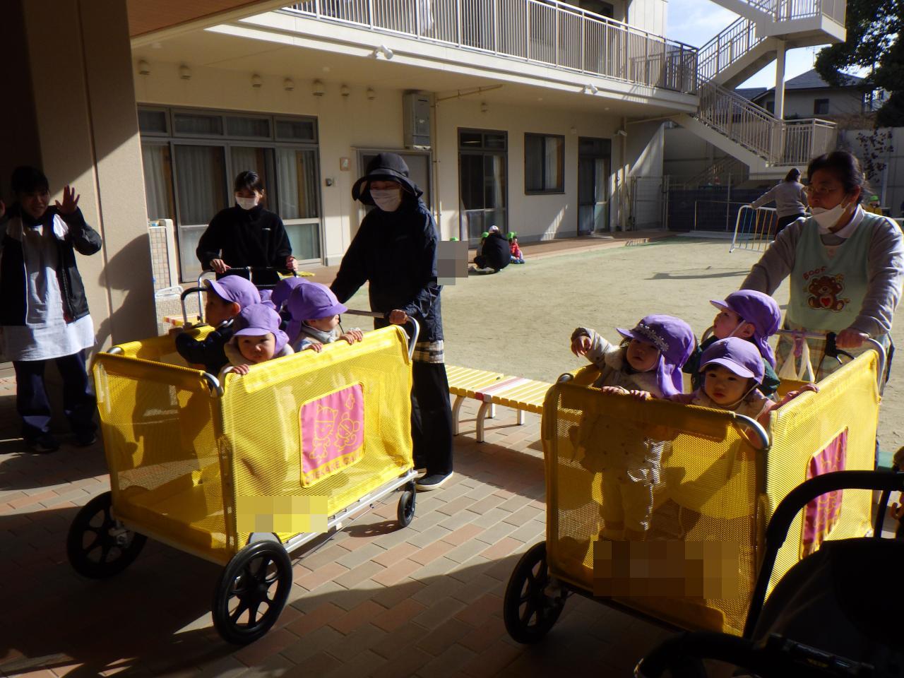 朝晩の冷え込みは厳しいですが、午前中は太陽の日差しが暖かく感じることも🌞0歳児クラスはカートに乗り「いってきまーす💨」と手を振ってお散歩に出発です❗保育園を出ると、公園の木の枝や葉っぱ、風に揺れる草、道行く車やバスに子どもたちの目もキラキラ✨と輝いていました。