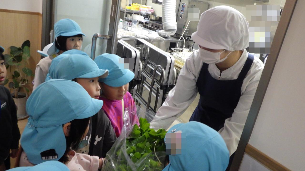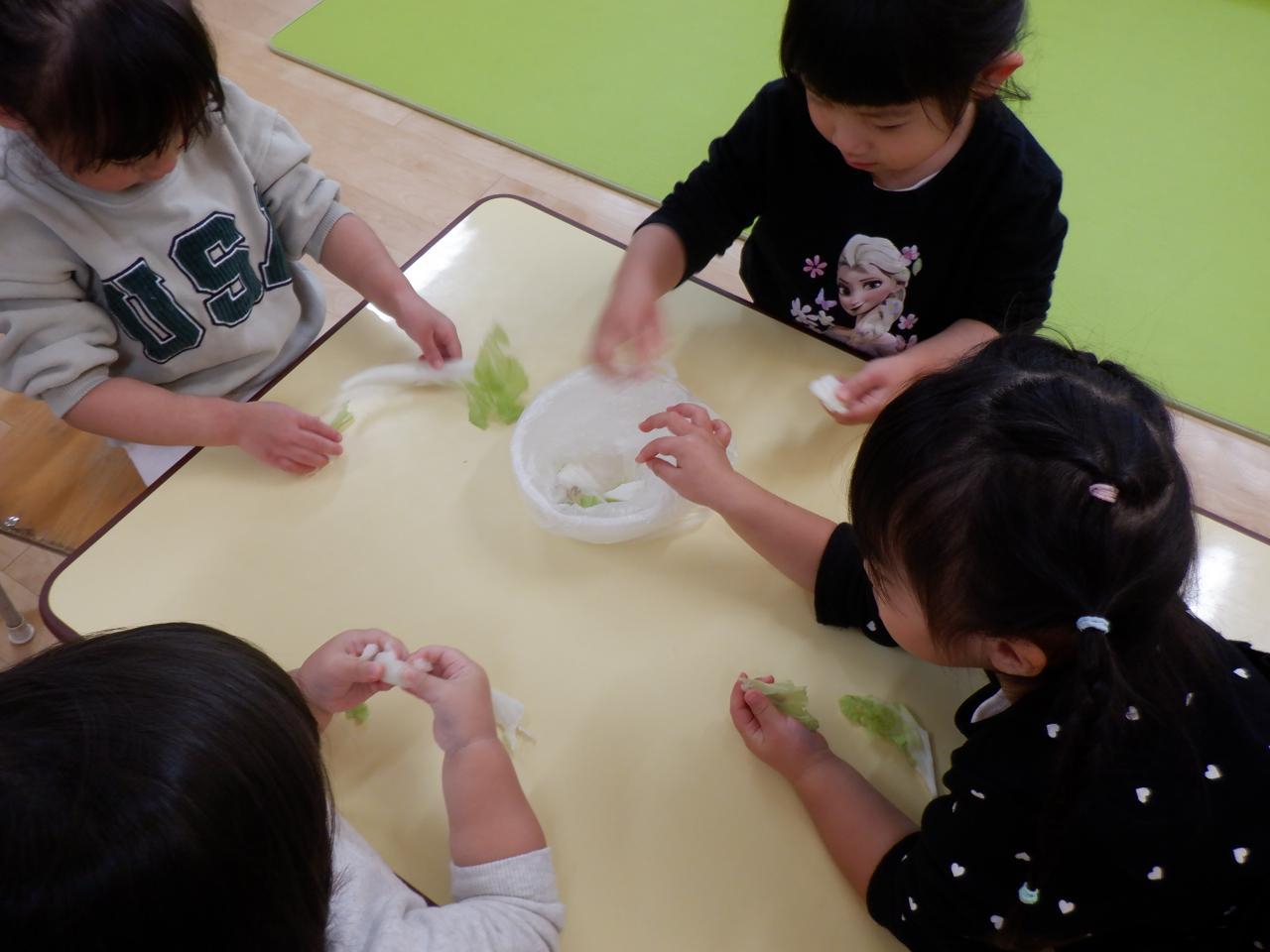 2~5歳児クラスは調理手伝いをしました✨2歳児クラスの子どもたちは、白菜ちぎりをしました。つまんでひねって、たくさんの白菜を小さくちぎっていましたよ😀3歳児クラスは、シメジちぎり、4歳児クラスは、ネギ切りを手伝いましたので、保育室は、様々な食材の香りで包まれました。