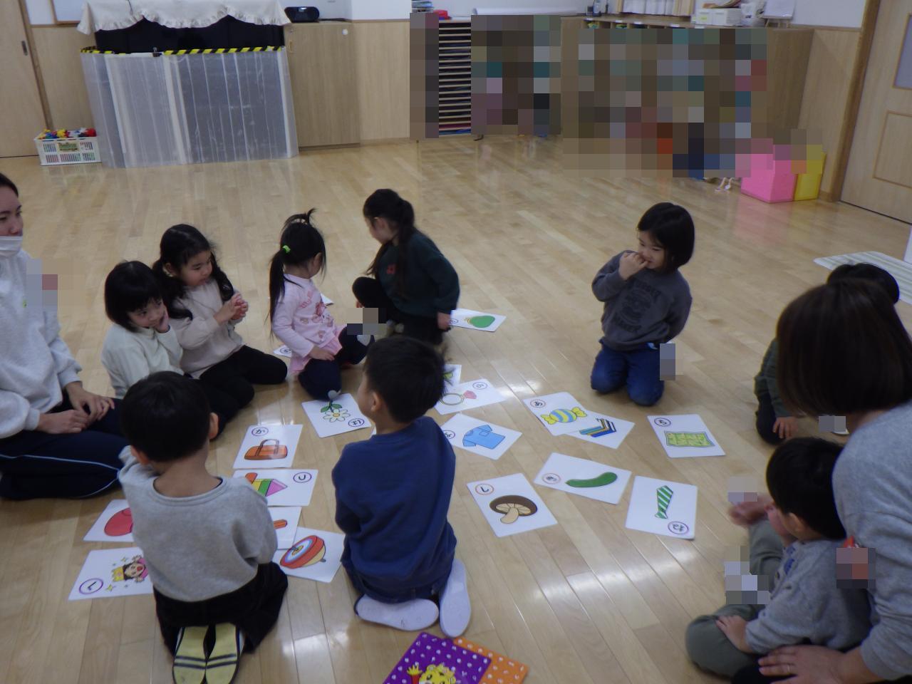 年が明け、幼児クラスでは、かるたや福笑いこままわしなどの「お正月あそび」にチャレンジしました🙂3歳児クラスでは「大型かるた」を楽しんでいました。『カバンはどこかな?』『次はさいふだよ』と保育者が伝えると、しんと静まりかえり、真剣なまなざしで「あった!」「これかな?」と絵札を探す3歳児の子どもたちでしたよ❗