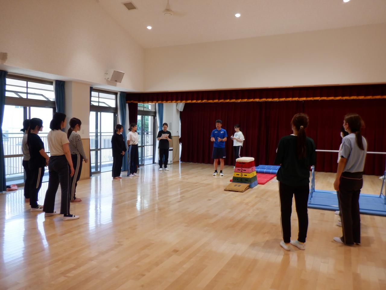 正課と課外の体育あそびでお世話になっております(株)エルステップスの西尾先生を講師に迎え、子どもたちが遊んでいる鉄棒や跳び箱、マットあそびの補助の方法を教えていただきました。