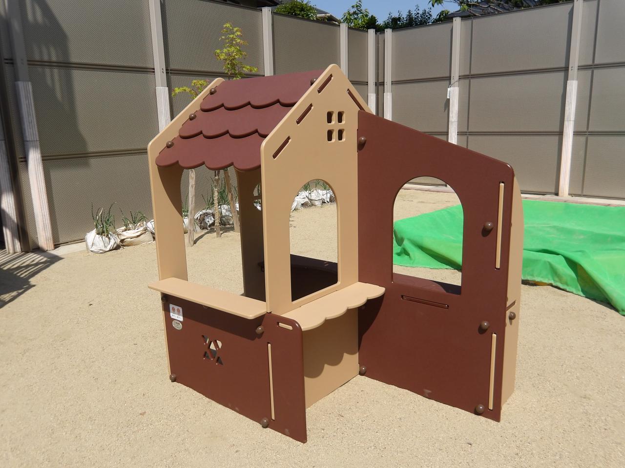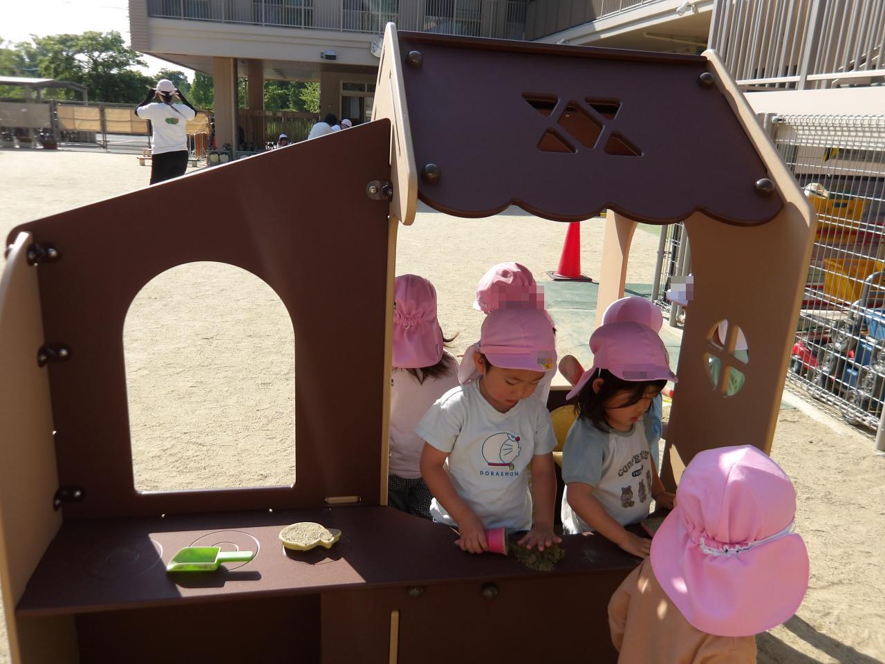 早速、子どもたちが、「あたらしいおうちでーす🐸」「いらっしゃいませ🍒」と、お友だちと楽しんでいました😄。色々な方向から遊べるのですが、ハウスの中に入ることが一番人気でした。