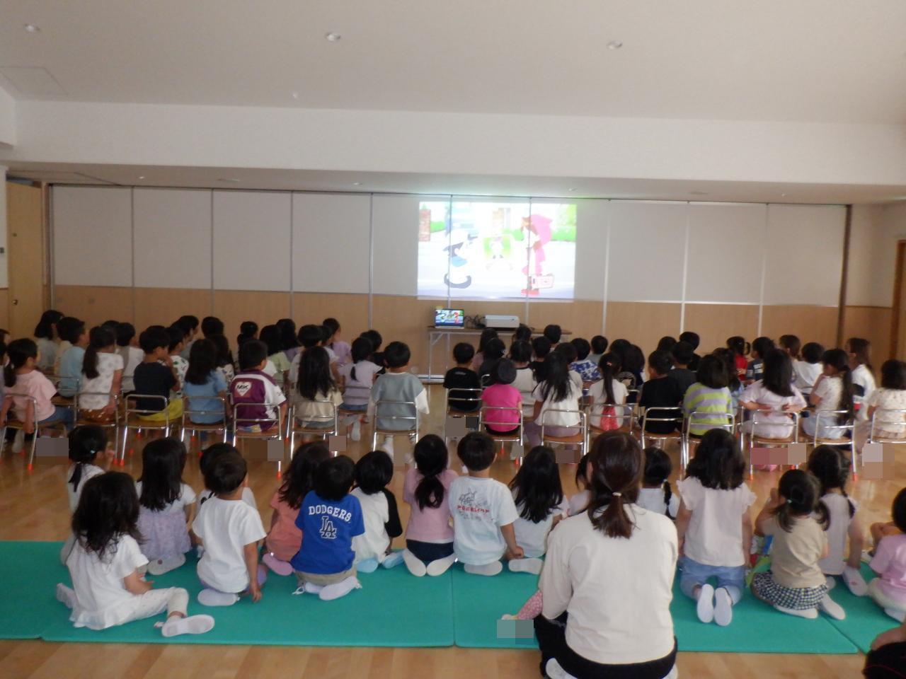 お散歩で園外に出るときの歩き方や、信号など、様々な危険について学びました。真剣に見ている子どもたちでした。