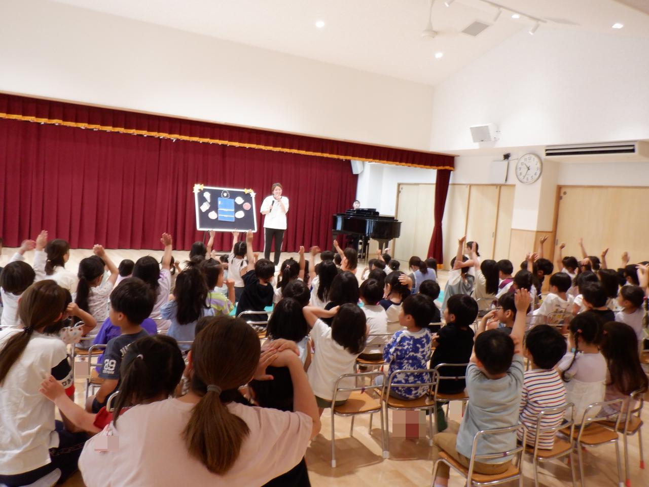 3歳児「て👏をたたきましょう」4歳児「いぬ🐶のおまわりさん」5歳児「すずめ🐤がサンバ」の歌では、それぞれ身振り手振り付きで誕生児の子どもたちも一緒に歌ってとても楽しそうでした。