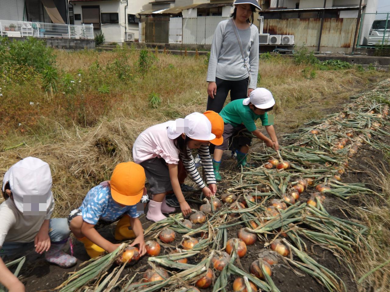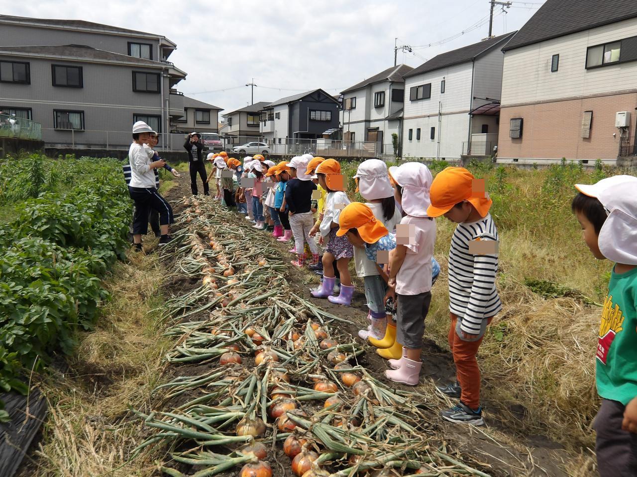 30分ほど坂道を下り、牧野保育園の畑に着きました。大きなたまねぎが、ゴロゴロと出来ていて、土から顔をだしていました。