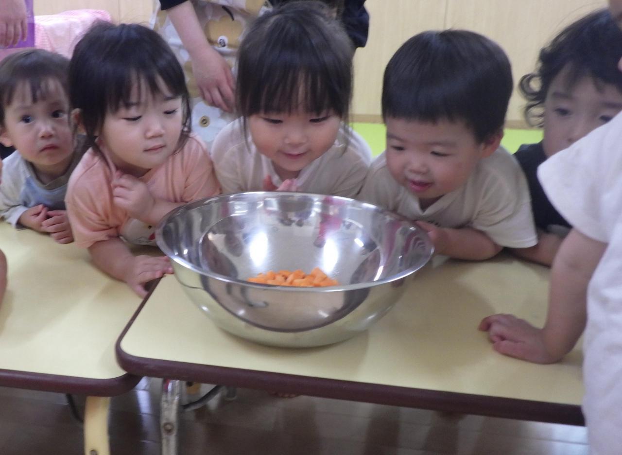 ♪にんじーん、たまねぎ~・・・と、保育者が歌いながら、食材をお鍋に入れます。『おいしいカレーになあれ💕』😋