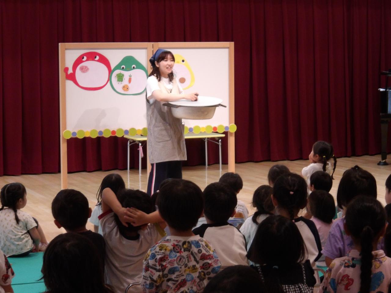 『あかっち』『みどりん』『きーぼー』というキャラクターも出てきて「力になる食べ物は❓」「元気になる食べ物はどれかな❓」など、クイズコーナーもあり、子どもたちが真剣に考え、答える姿もありましたよ😄