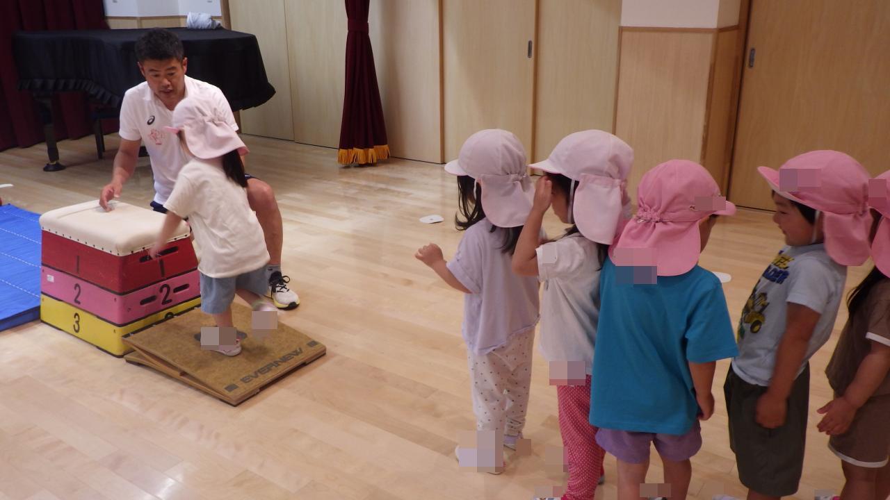 最初はドキドキして近づいてきていた子どもたちでしたが、何度か繰り返すうちに西尾先生との息もあい「グー・・・、パー❗」と、思い切って跳び箱の上にとび乗る姿もありました。順番を待って並ぶことも楽しくて仕方の無い様子でした。