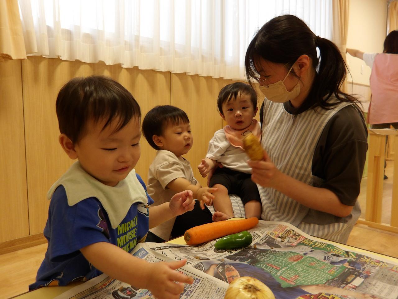 0歳児クラスの子どもたちも『なにかな❓』と、手を伸ばし興味津々です❗にんじん🥕や、たまねぎ、じゃがいもは離乳食にも登場する野菜です✨。