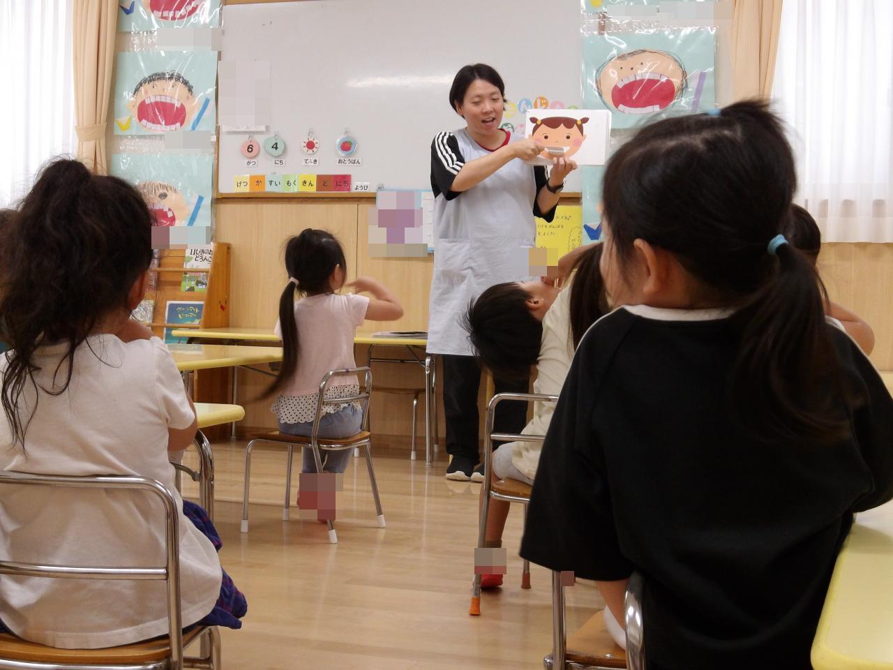 阪保育園では子どもたちに歯の大切さを知ってもらうことをねらいに、3歳児から5歳児の子どもたちに、看護師から紙芝居やクイズを交え、虫歯になりにくい食べ物や正しい歯磨きの方法のお話を聞きました✨