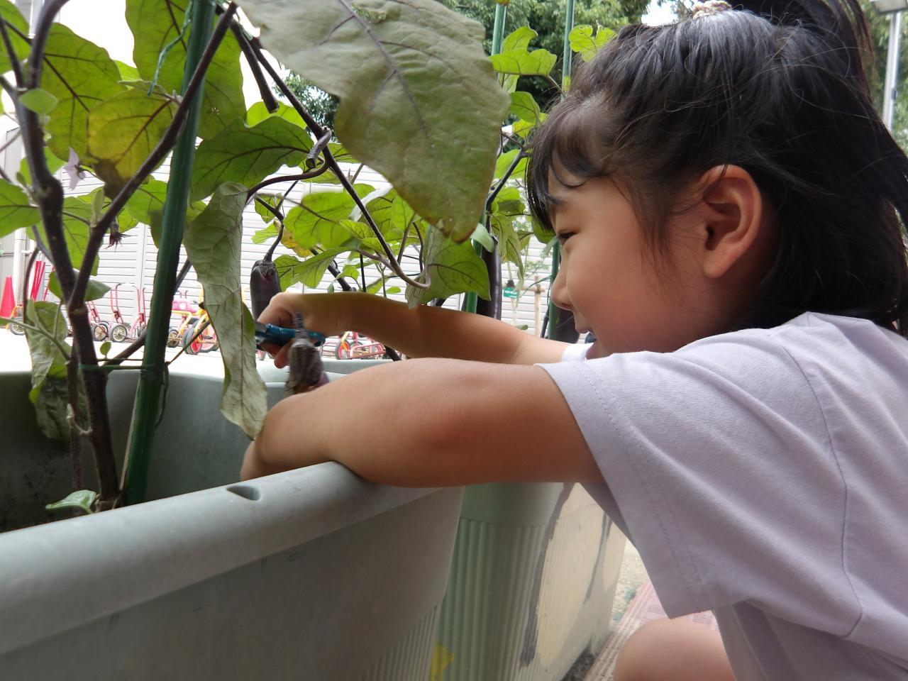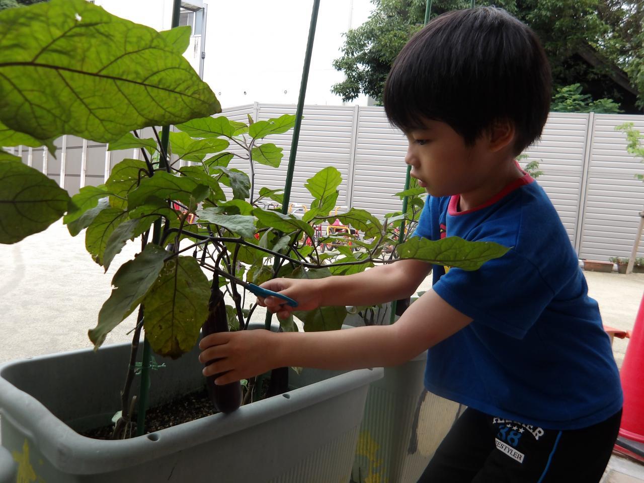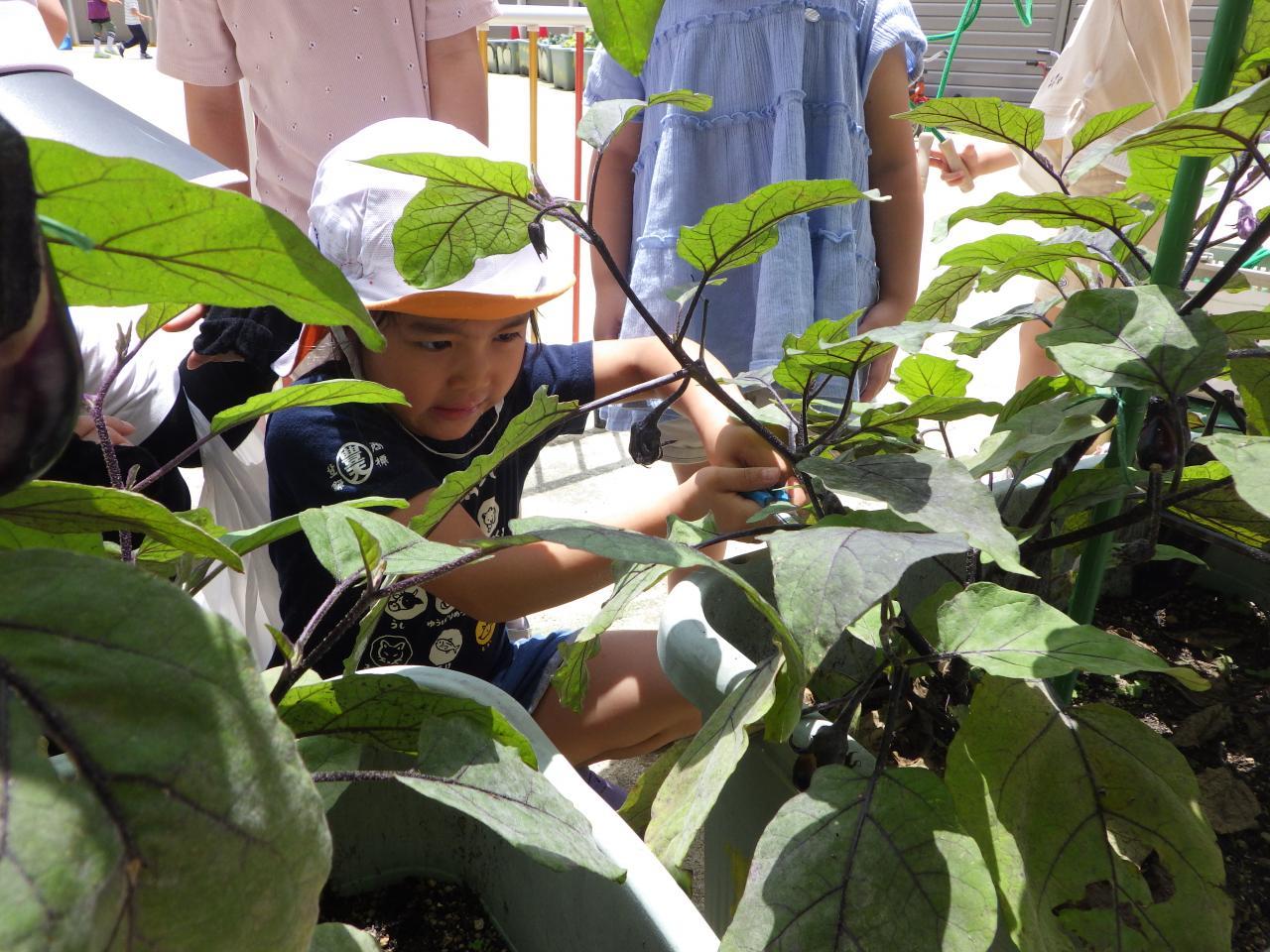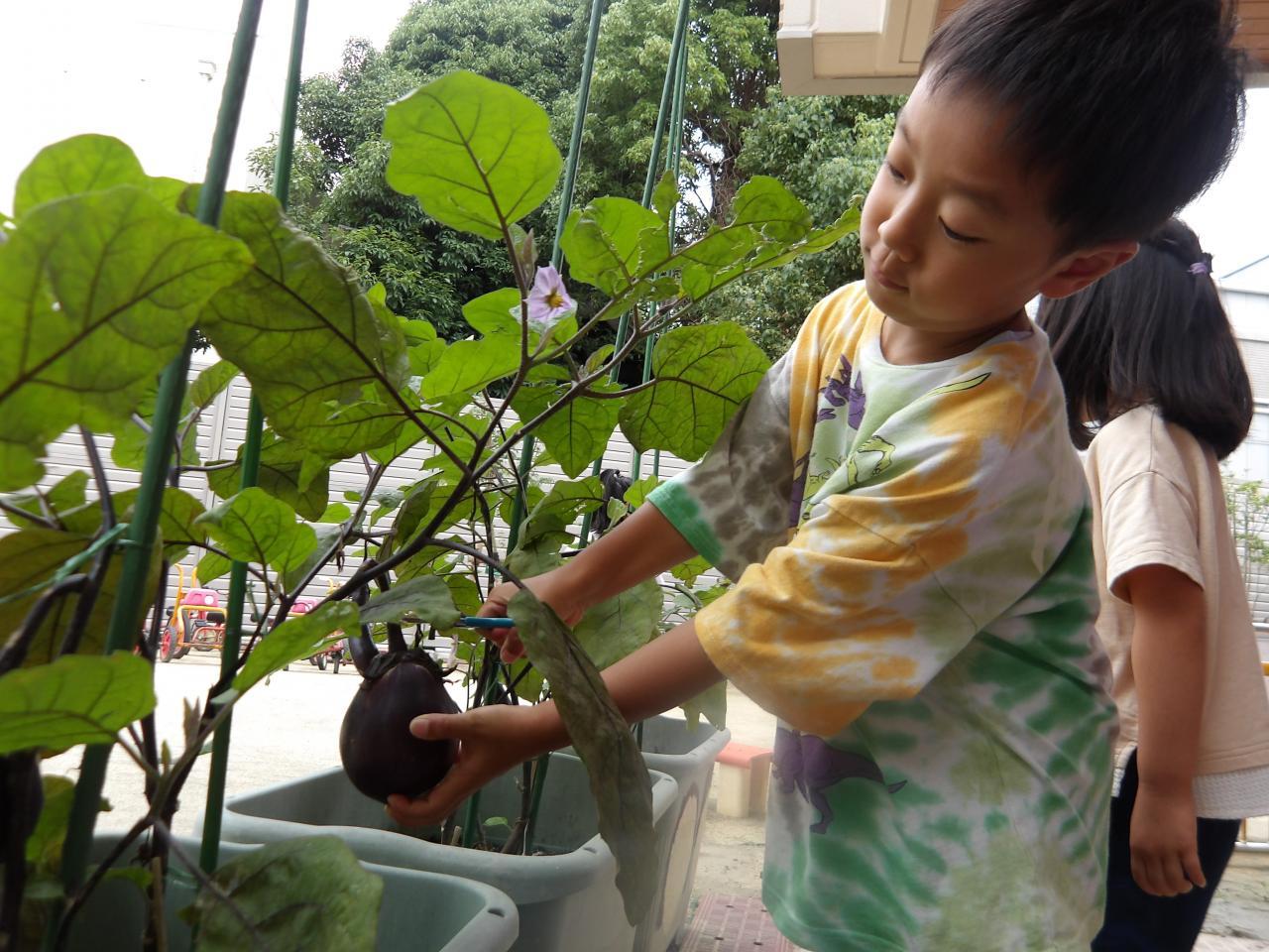 大きくなり食べ頃になったナスを、日々、子どもたちが収穫しています。