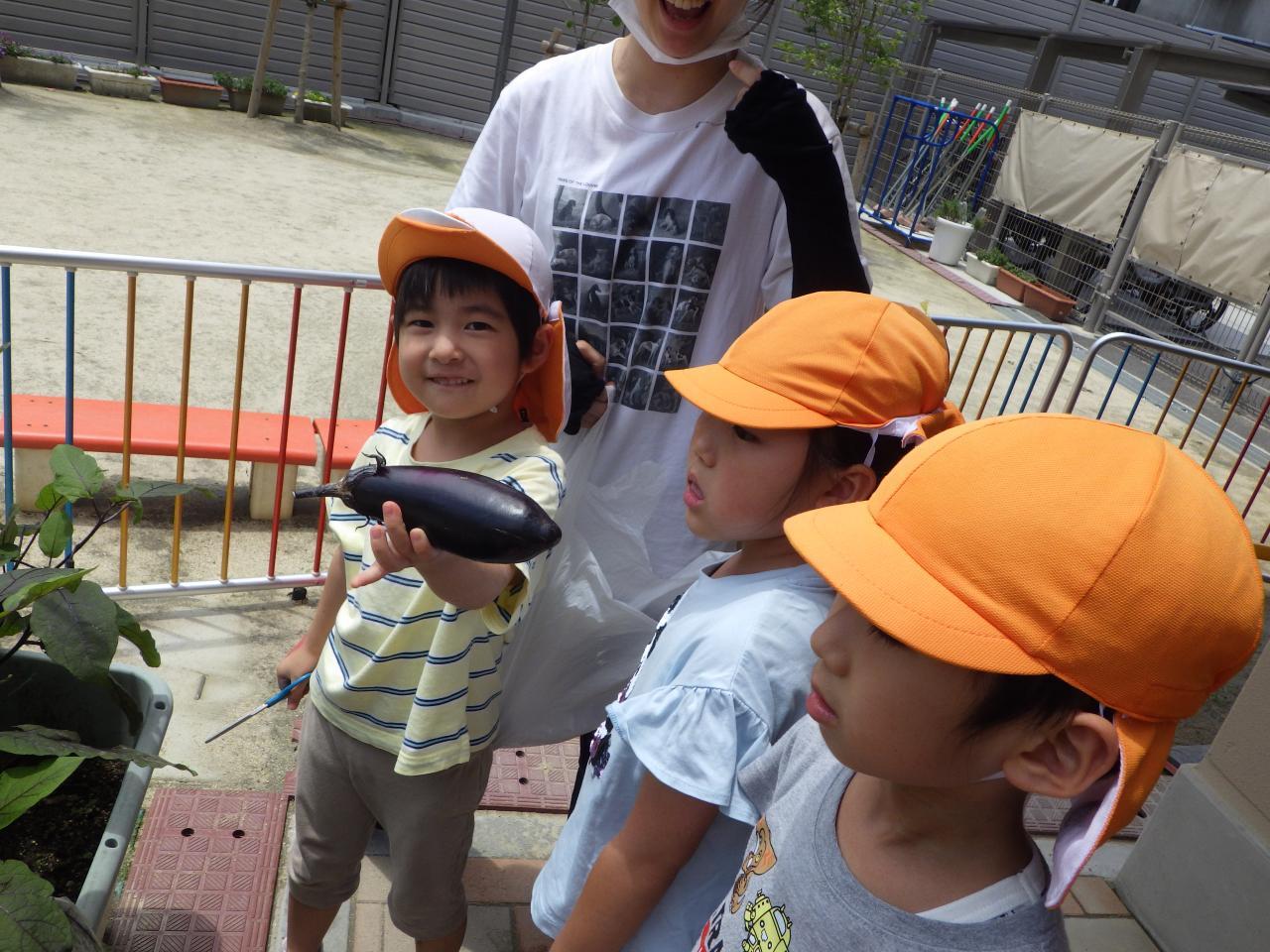 収穫したナスは、ピカピカでとっても美味しそう!新鮮なナスの帽子はチクチクしていました。お泊まり保育では、カレーの具に仲間入りしました。