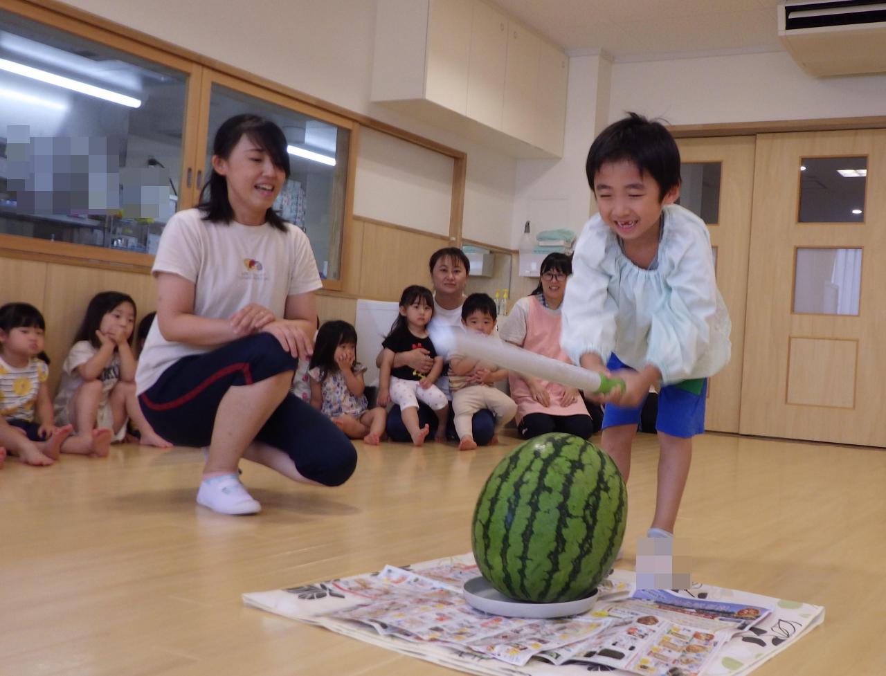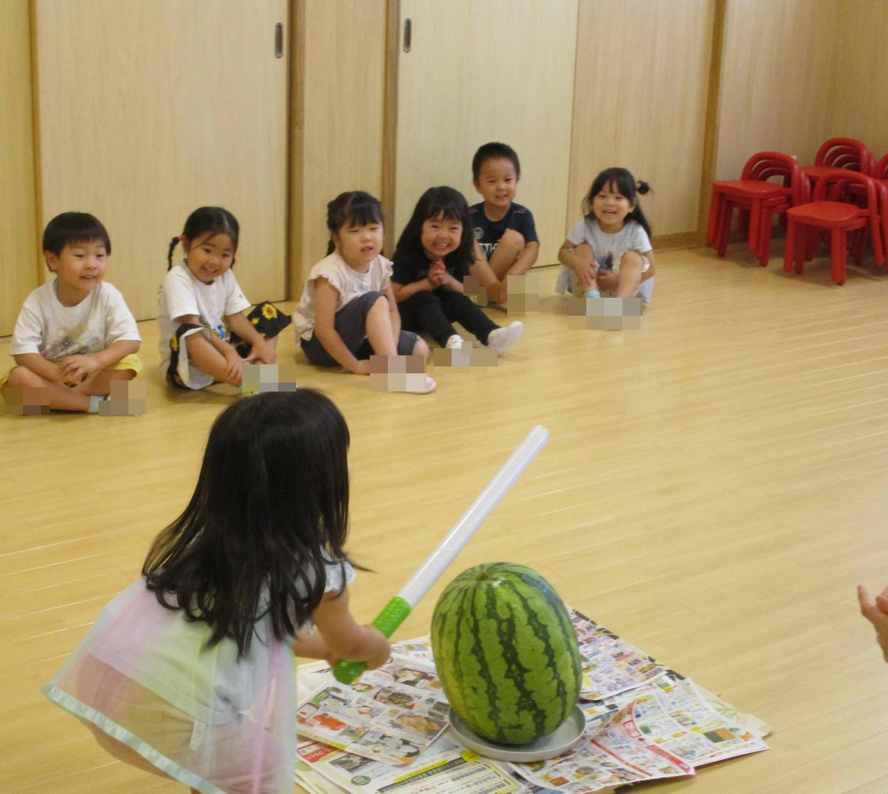 幼児クラス1クラスずつランチルームに集まり、ひとりずつ目をつむり棒を振りかぶって、「エイッ」とスイカに振り下ろしました。
