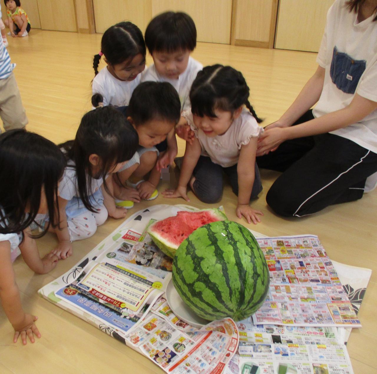 スイカわりで割れたスイカは先生たちがいただき、子どもたちは調理の先生が包丁で切ってくださったスイカをいただきました。夏ならではの楽しい1日でした。山条さんありがとうございました🍉。