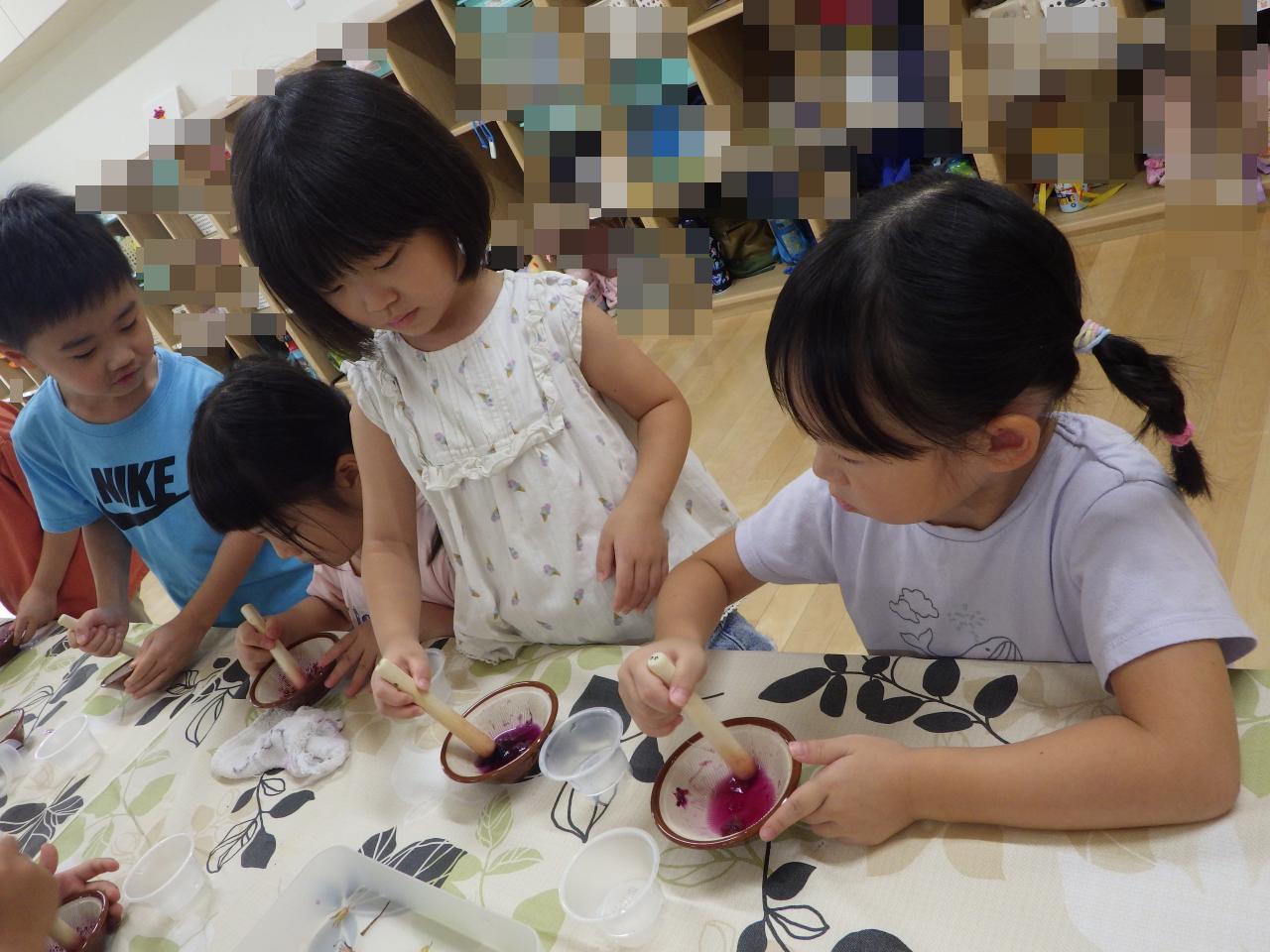 ドキドキしながら、子どもたちは自分の選んだしぼんだお花をすりつぶし、少しお水をいれると、咲いていたお花の色でそれぞれ微妙に違う色水ができることを大発見💥しました‼