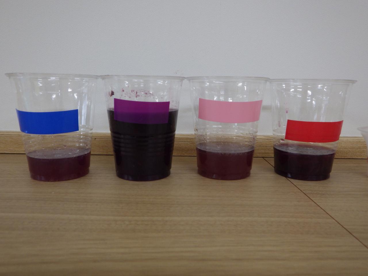 子どもたちは、「つぶしたらきれいなピンクになった!」「こっちは紫に見えるで!」と、微妙な色の違いを見つけて大喜びしていました🙌。