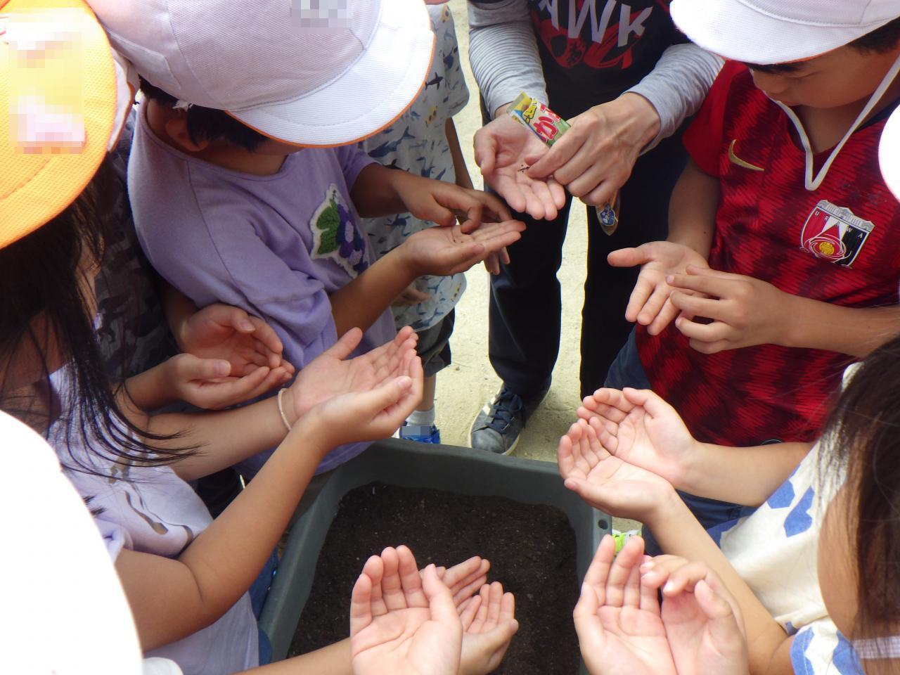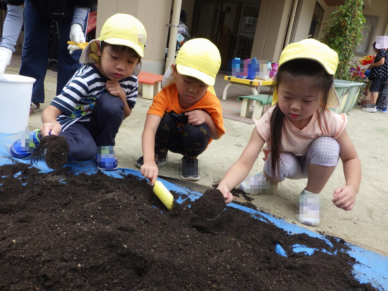 5歳児クラスの子どもたちは冬野菜に大根とカブを植えます。とても小さな種に少し驚いた表情をしていた子どもたちですが、落とさないように指先で種を持って植えると優しくそーっと土をかぶせていました。「大きな大根できるかな?」と、とても楽しみにしていました。出来上がった野菜は子どもたちが調理手伝いをして給食でいただきます✨。