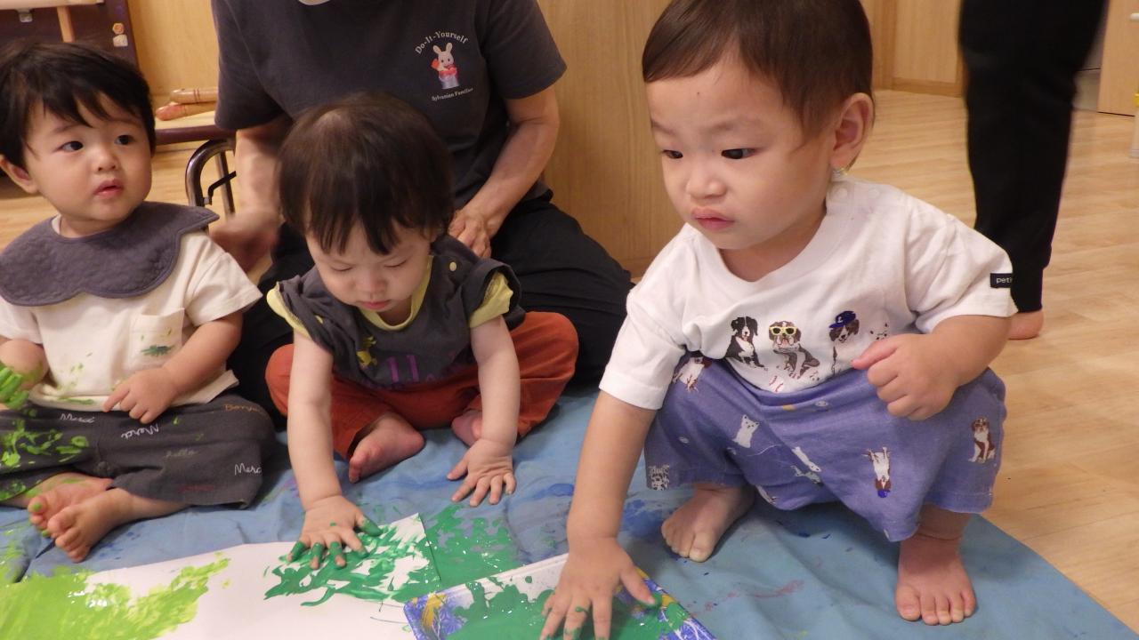 0歳児クラスの子どもたちは、えのぐの塗り広げを楽しみました。小さな手をぱっ🙌と広げて大きな紙にダイナミックに絵の具を広げて遊ぶ姿がありました。はじめての感触を味わう中で、様々な表情を見せてくれました🥰。