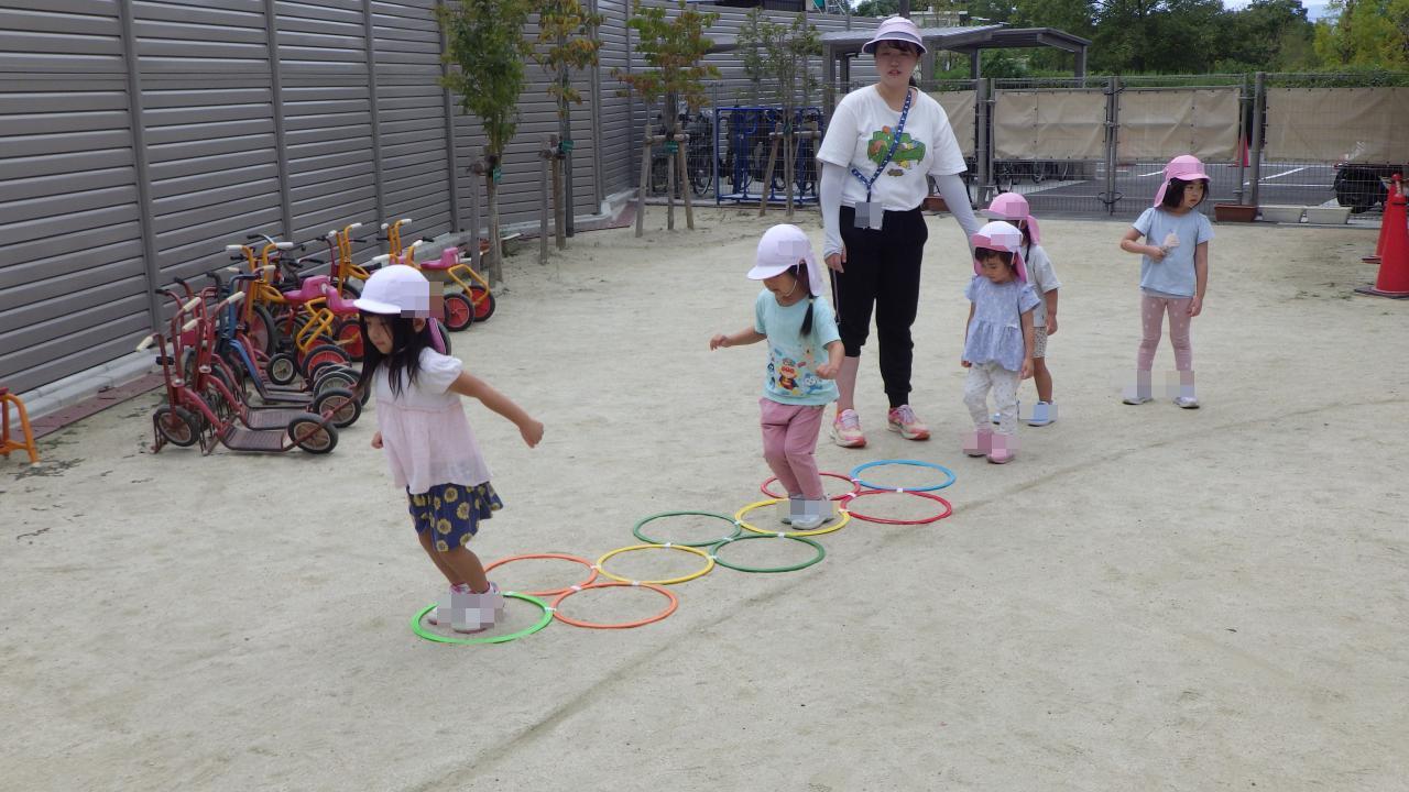 足をそろえて両足で「グーパー!グーパー!」と、ジャンプをしています。最後は「できた‼」と嬉そうにお友だち同士で顔を見合わせ笑っていました😄。