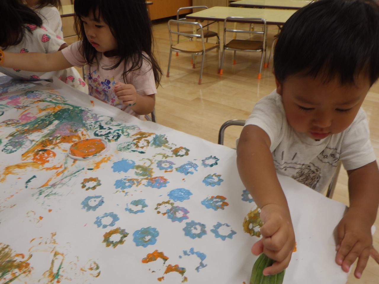 2歳児クラスの子どもたちは野菜スタンプを楽しみました🥒。幼児クラスの子どもたちが大切に育てて大きくなった巨大オクラを使って、触ったり匂いを嗅いだりした後に、えのぐを付けてスタンプをしました。オクラの形が星のように見えて「キラキラ~✨」「お星さま~⭐」と、笑顔で言っていました。みんなでスタンプした模造紙をTシャツ型に切りとって、保育室に飾りました🍒。