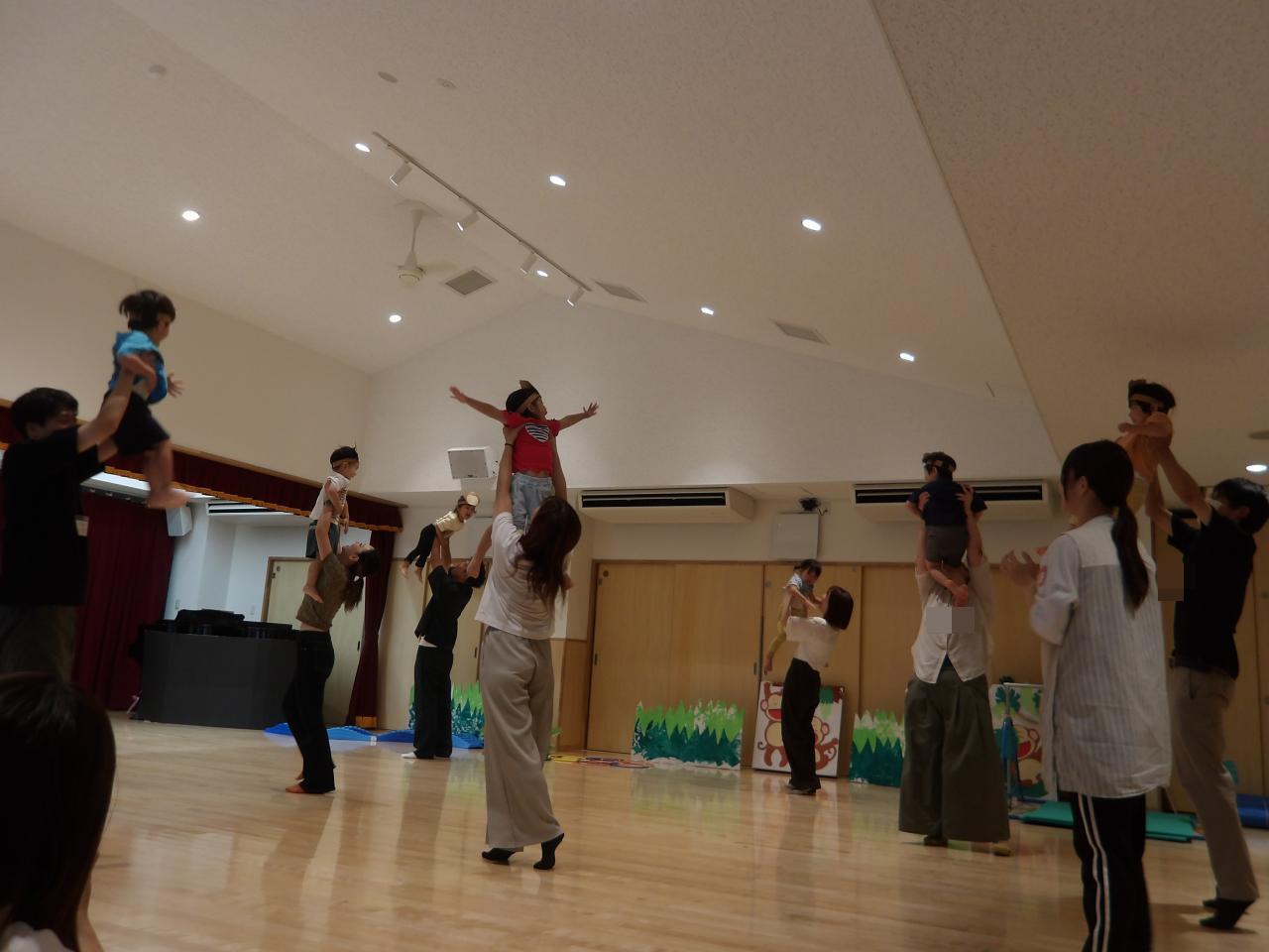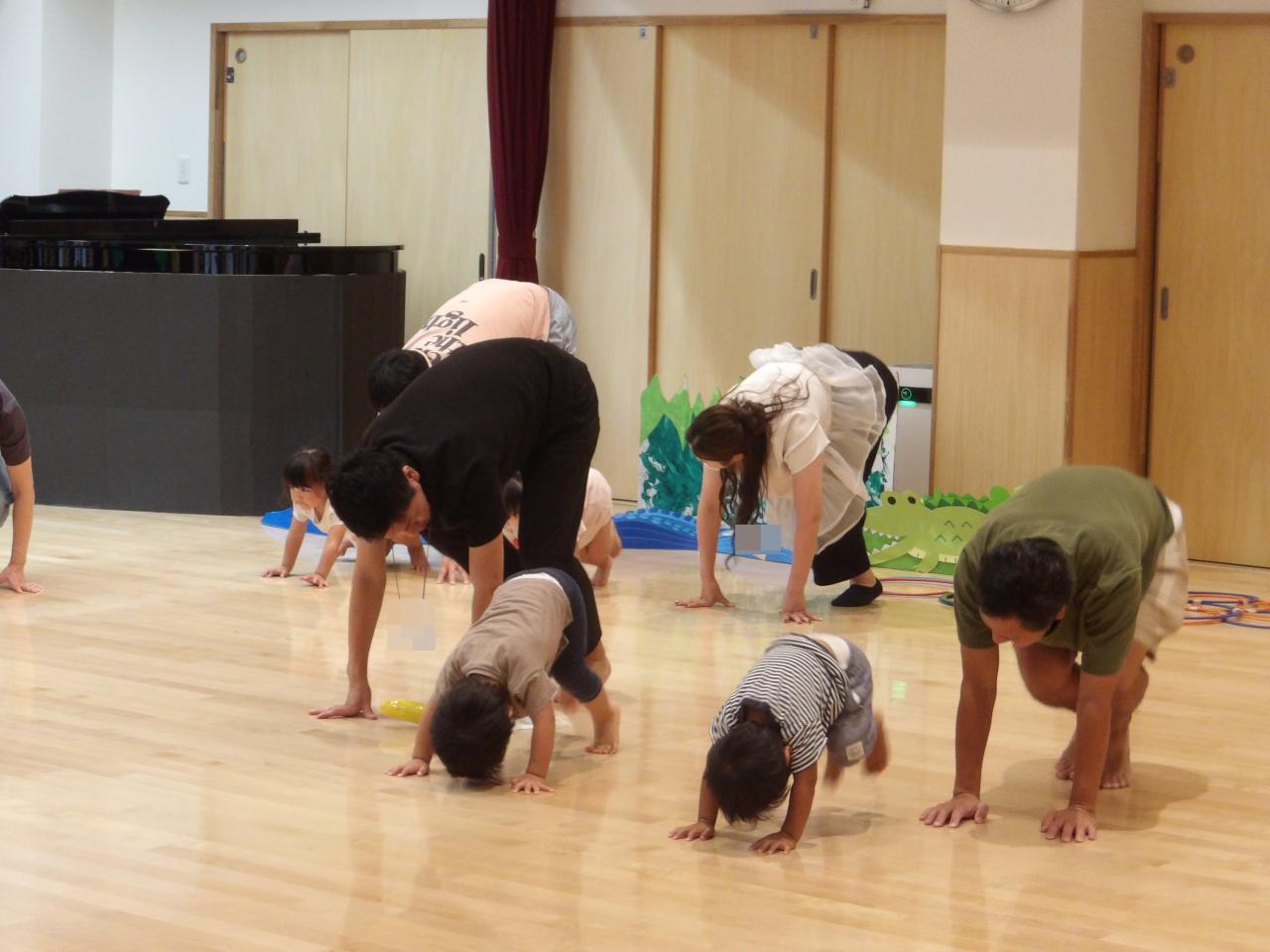 「あさのうた」を歌って、お家の方と一緒に「あひるのダンス」の曲に合わせて準備体操を兼ねてダンスをしました。親子でおしりを振る様子がとてもかわいらしかったです。
