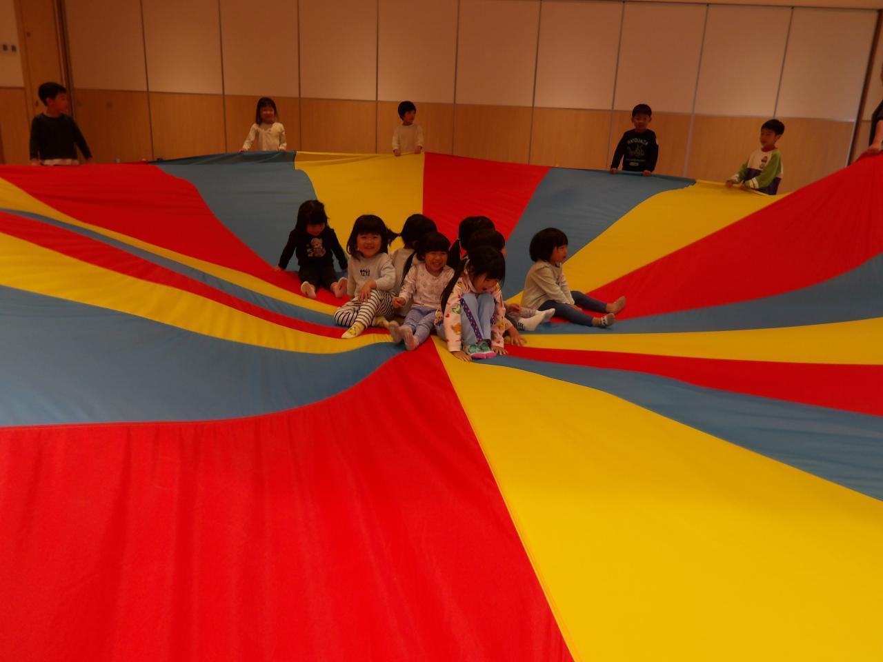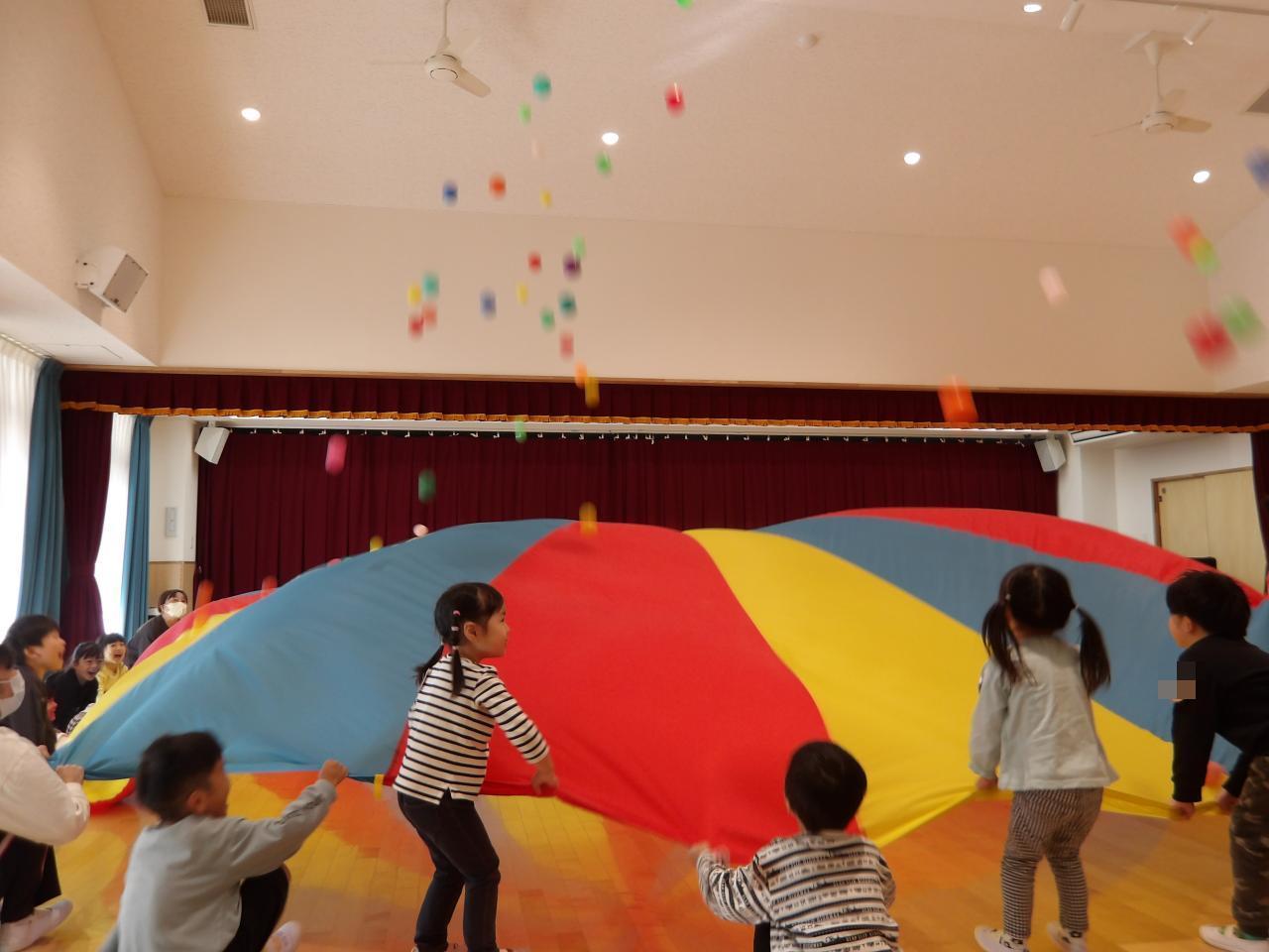 パラバルーンでは、お遊戯室や園庭、保育室で楽しんできた「イロトリドリ」の曲に合わせて披露しました✨。横歩きの時は「かにさん、かにさん❗」また、上下に揺らすときは「おせんたく、おせんたく❗」と、みんなで声をかけあい演技しました。「きのこ」や「メリーゴーランド」など、色々な技を表現した子どもたち。保護者の方からの拍手に、とても嬉しそうな笑顔😄でした。