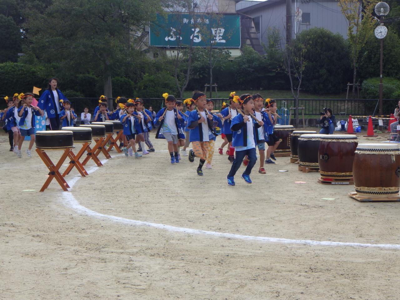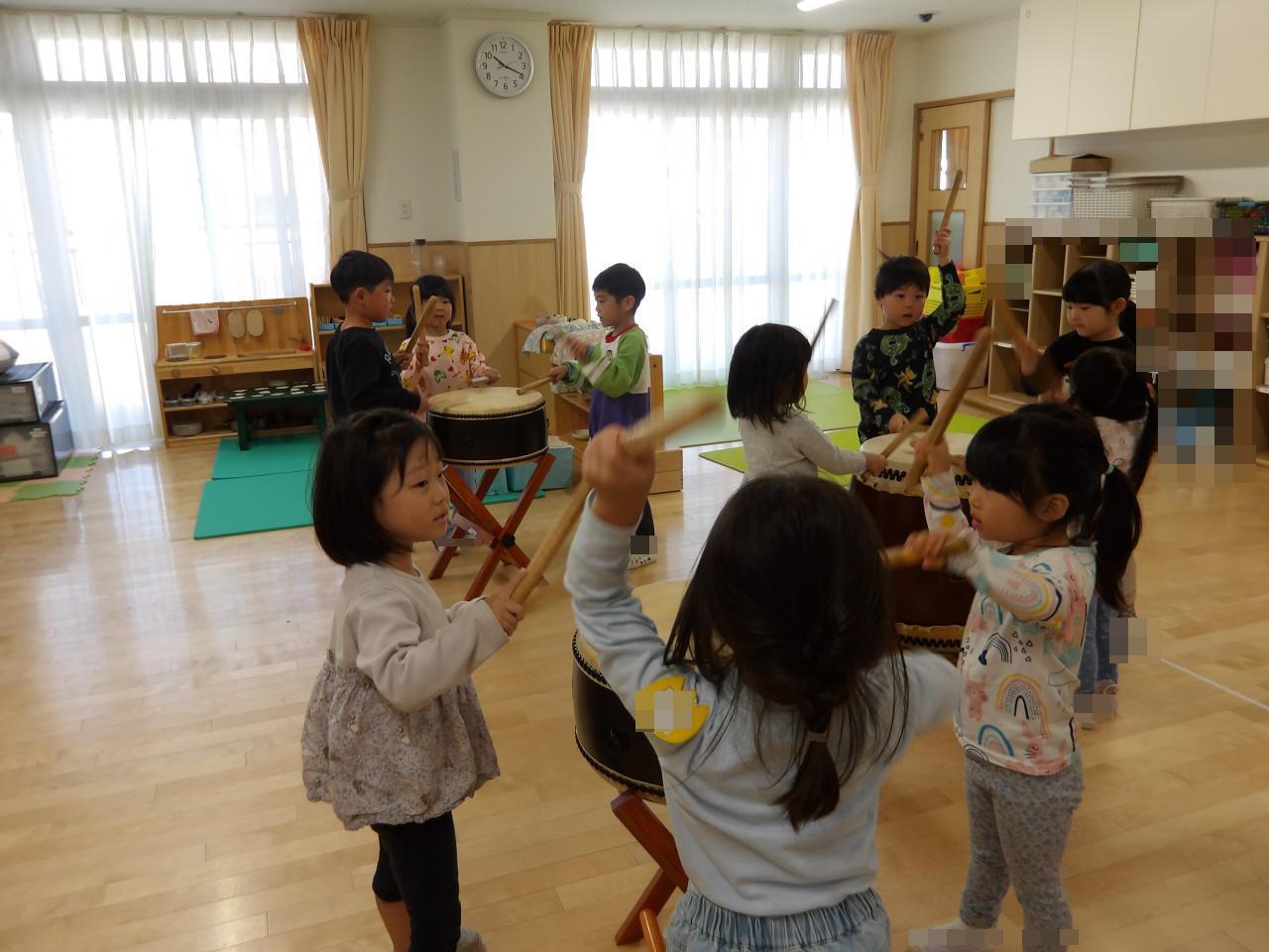 5歳児は和太鼓からスタートしました。いつになく緊張した面持ちでしたが、担任のかけ声とともに和太鼓の演奏が始まり、力強くバチで太鼓を叩く姿はさすが5歳児さんでした💕。
