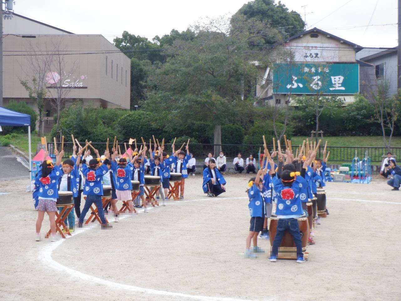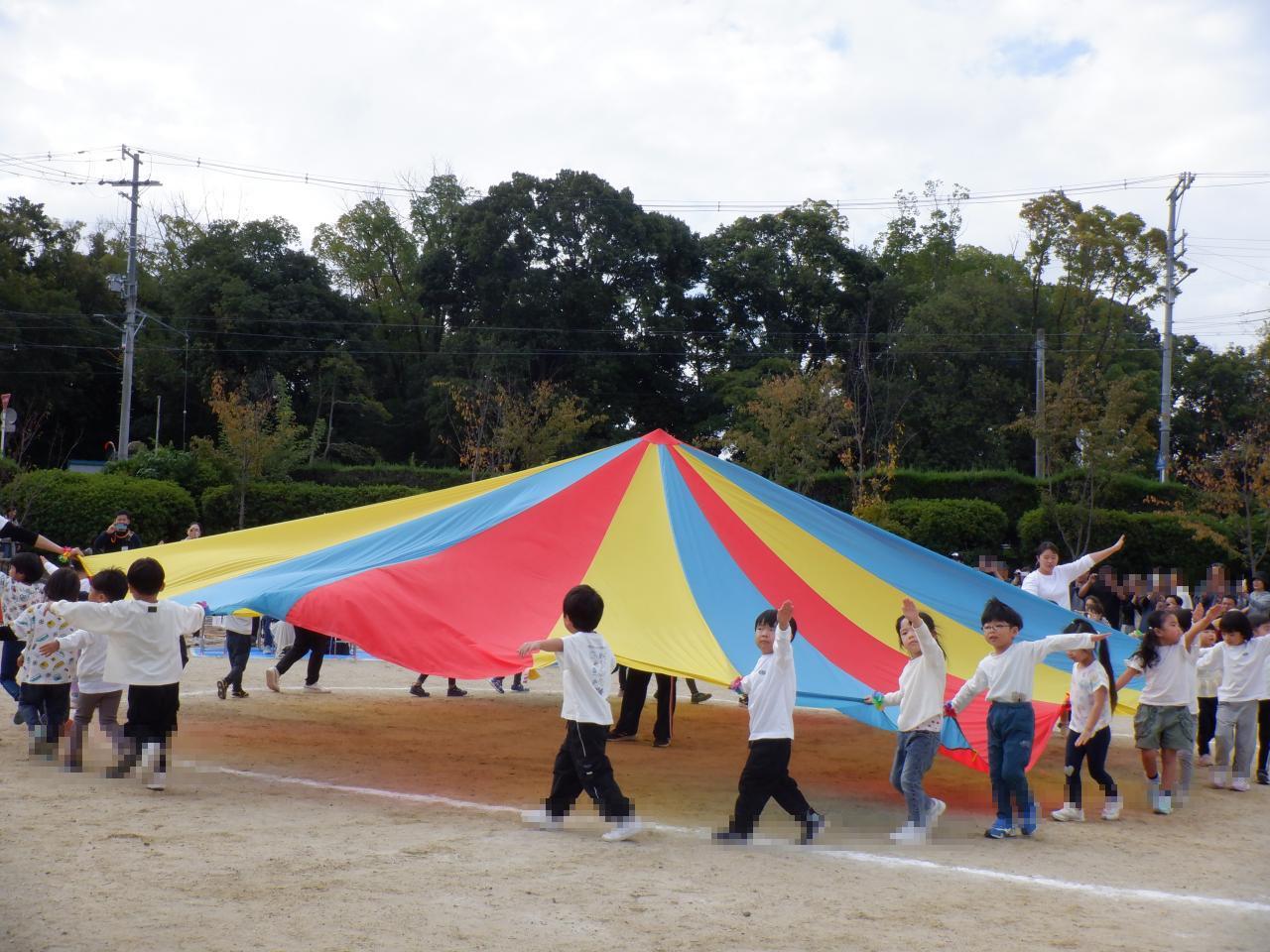 幼児クラスの運動会が無事に終わり10/28(火)には、幼児クラスの子どもたちが縦割り保育の活動の中で『運動会ごっこ』を行い、運動会で披露した和太鼓とパラバルーンあそびを楽しみました🌈。