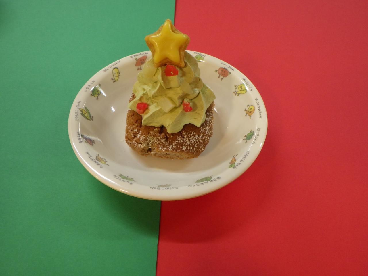 今日のおやつは『クリスマスカップケーキ🎄』でした。子どもたちも「ツリーみたい🎄」お星様のクッキーと少しだけ抹茶風味のする甘いクリームで、ツリーのような可愛らしいケーキをニコニコ笑顔でいただきました😀。
