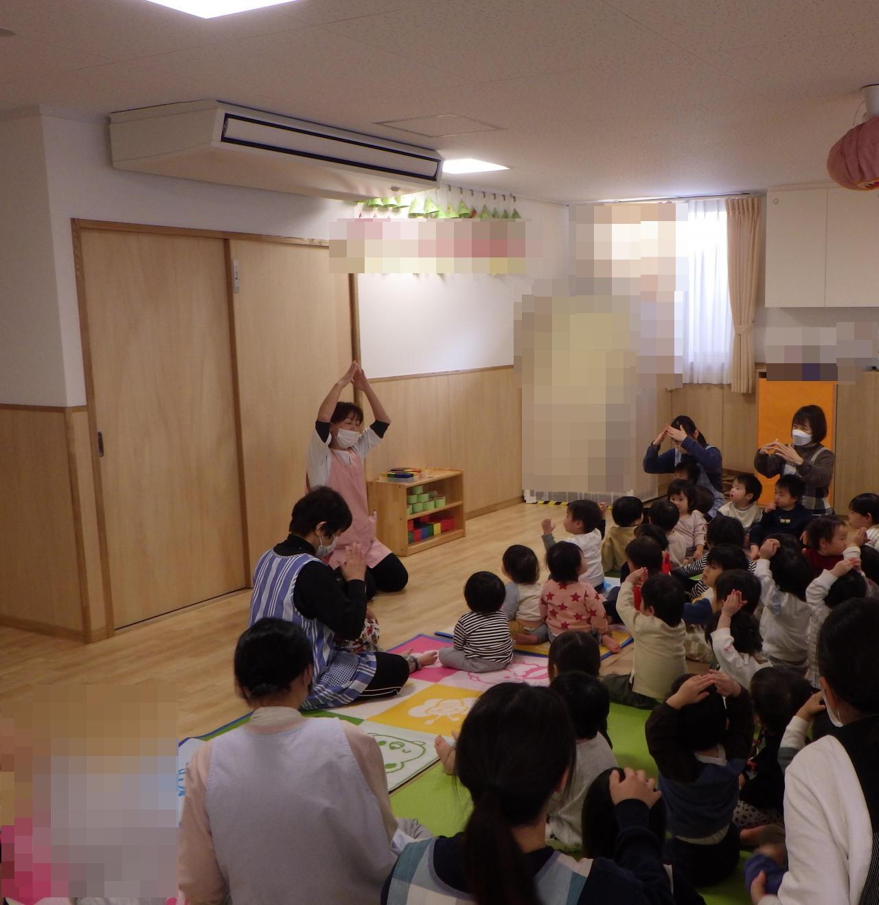0、1歳児クラスは保育室でのクリスマス会でした。クリスマスの歌を歌ったり、手あそびをしながらみんなでサンタクロースになったりと、楽しい時間を過ごしていると・・・