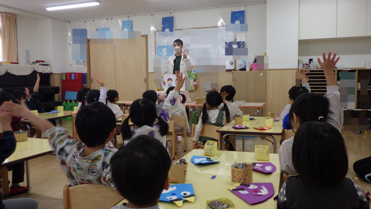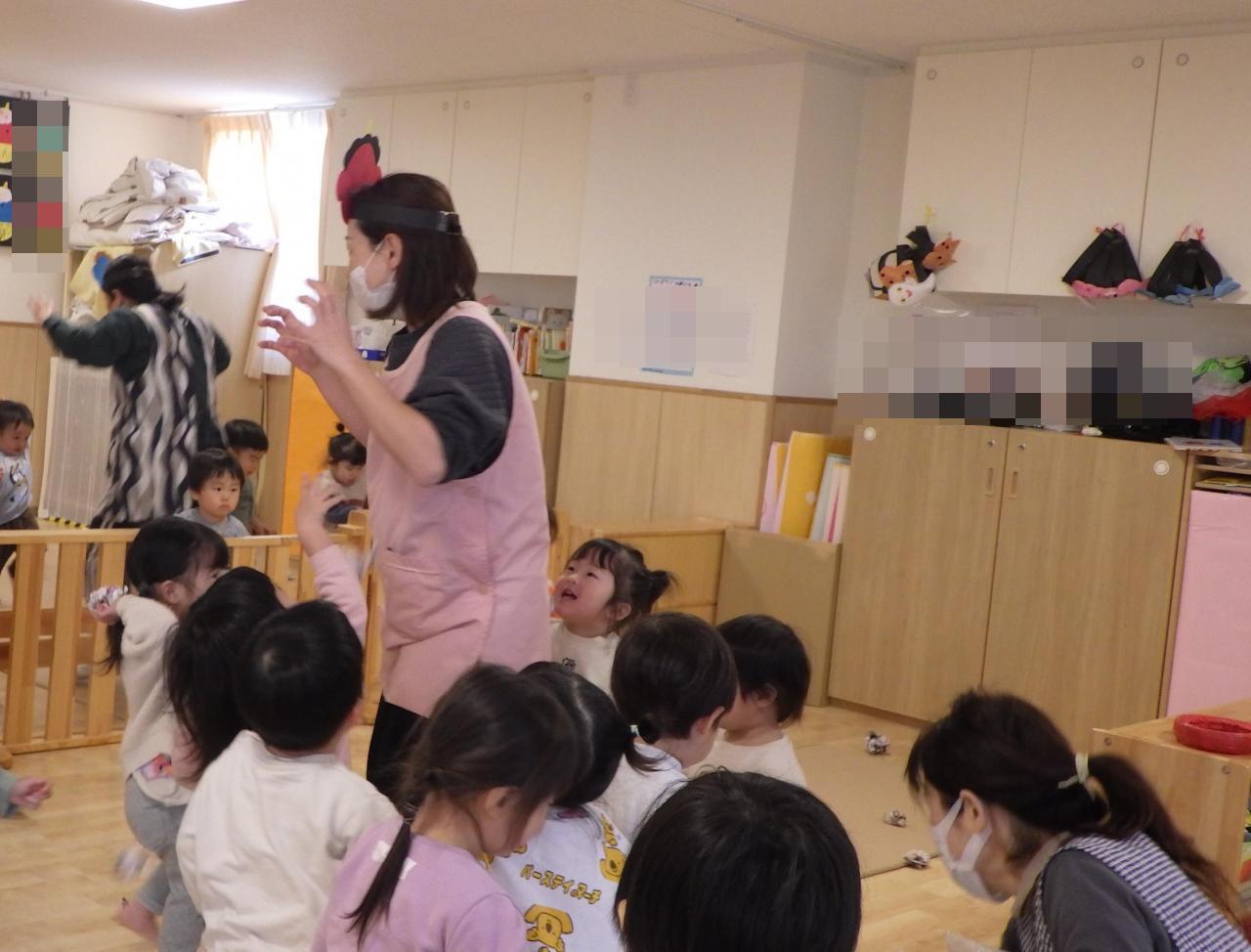 阪保育園では1日早く節分行事を行いました。乳児クラスでは♪豆まきの歌を歌ったり、保育者や友だちと新聞紙で作った「豆」で豆まき一緒にしたりしました🙂。