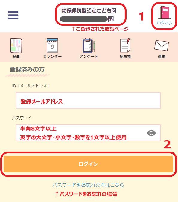 ・ログインページ:登録された施設ページの右上「ログイン」ボタンよりアクセスしてください。
