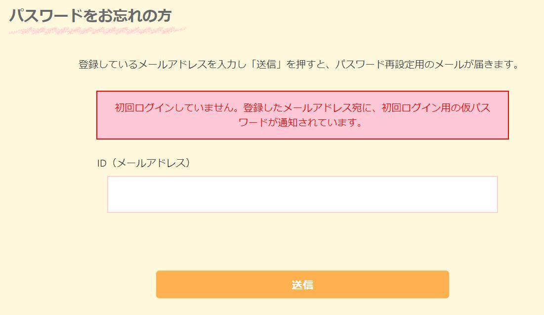 「パスワードをお忘れの方はこちら」でパスワードの再設定をする際、メールアドレスを入力すると「初回ログインしていません」のエラーメッセージが表示される方は、仮パスワードの有効期限が切れています。