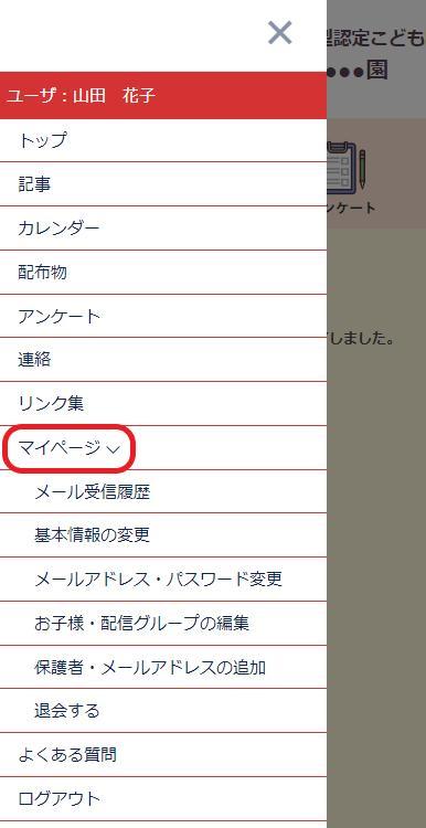 4.施設ページへログイン > 三本線のメニューバーから【 マイページ 】>【 お子様・配信グループの編集 】。